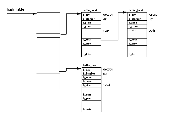 Block buffers within the cache are uniquely identfied by the owning device identifier and the block number of the buffer. The buffer cache is composed of two functional parts. The first part is the lists of free block buffers. There is one list per supported buffer size and the system's free block buffers are queued onto these lists when they are first created or when they have been discarded. The currently supported buffer sizes are 512, 1024, 2048, 4096 and 8192 bytes. The second functional part is the cache itself. This is a hash table which is a vector of pointers to chains of buffers that have the same hash index. The hash index is generated from the owning device identifier and the block number of the data block. Figure 9.7 shows the hash table together with a few entries. Block buffers are either in one of the free lists or they are in the buffer cache. When they are in the buffer cache they are also queued onto Least Recently Used (LRU) lists. There is an LRU list for each buffer type and these are used by the system to perform work on buffers of a type, for example, writing buffers with new data in them out to disk. The buffer's type reflects its state and Linux currently supports the following types: